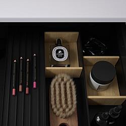 Få koll på småsakerna med vår snygga och praktiska Organizer i borstad svart aluminium och vitpigmenterad ek. Vänd på insatsen och avslöja smarta fack för sminkpennor eller tandborstar. Organizern följer med i alla våra kommoder i två ex. Plussa på med ett eller flera set om två för att fylla ut hela lådan. Organizern är 10 cm bred och följer den aktuella seriens låddjup.