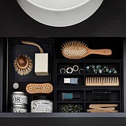 Fackindelad lådinsats eller smyckeskin i svartbetsad ek. Med tillhörande lock.